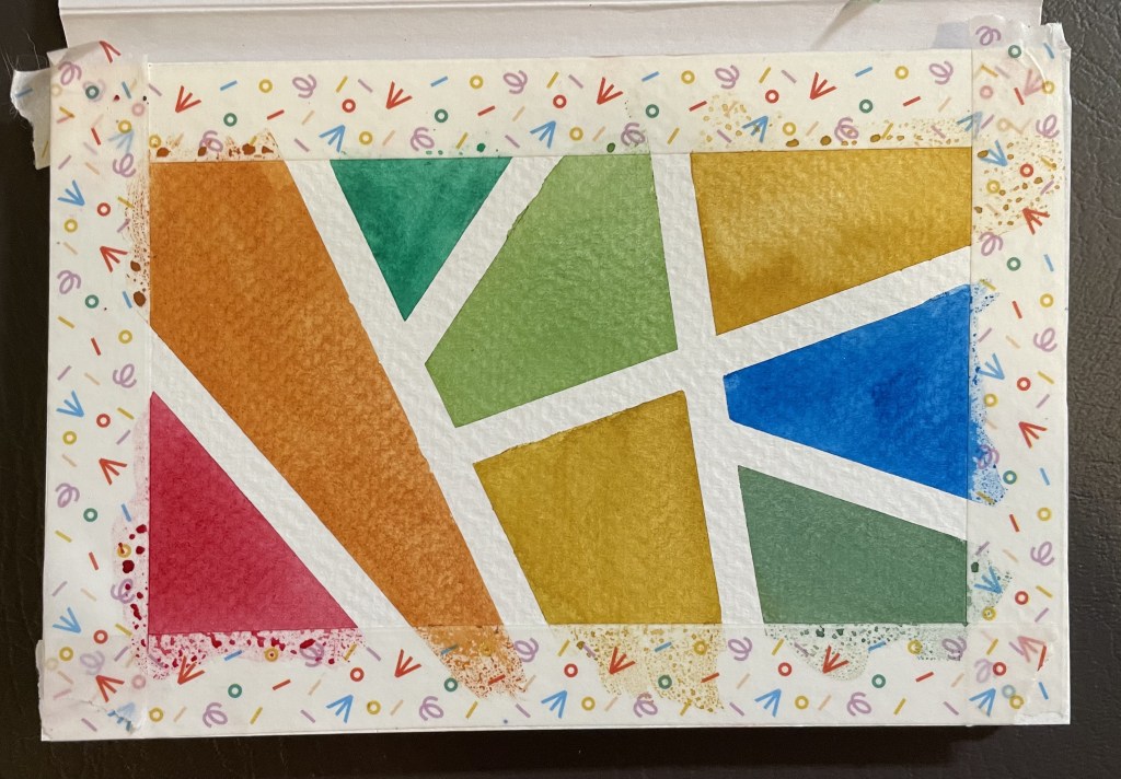 Aside from not having a glass studio, I also like the transparency of the watercolors-perfect for a stained-glass inspired project. I used washi tape to make a border and some random shapes. I meant to take a ‘before painting’ picture of this step… but somehow completely flubbed the picture. No idea how I managed that. It was just… fuzzy/in motion picture of the background I placed the paper on.