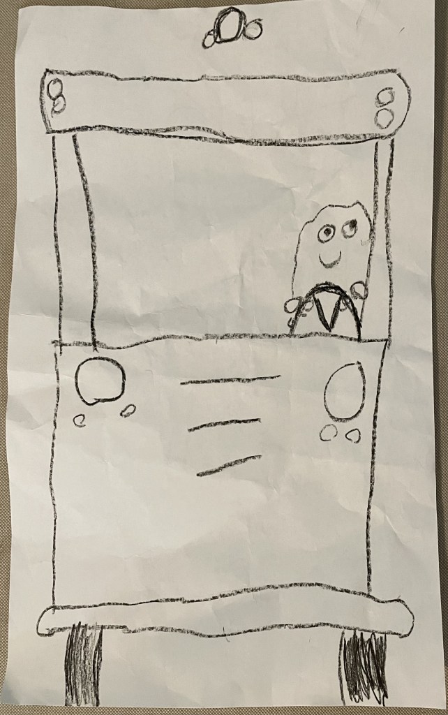 I absolutely adore this study piece by my son, completed and sent home at the beginning of the school year. Since then, when he has art class, he’s been working on this school bus but on yellow paper. A very important distinction to a 5 year old. I absolutely love the bus driver figure, whose essence really is summed up in the jovial and caring driver we have this year. I also see in it an arrival (by drawing the bus head-on), and some rather impressive detail work in the big and little lights, as well as the lines creating perspective in the front. Yes, I realize this was led by his teacher, but gosh darn it it’s so cute! The whole thing is just happy and inviting, and it communicated to me that he felt welcomed and happy to be in school. What a big deal that is, and easy to overlook!