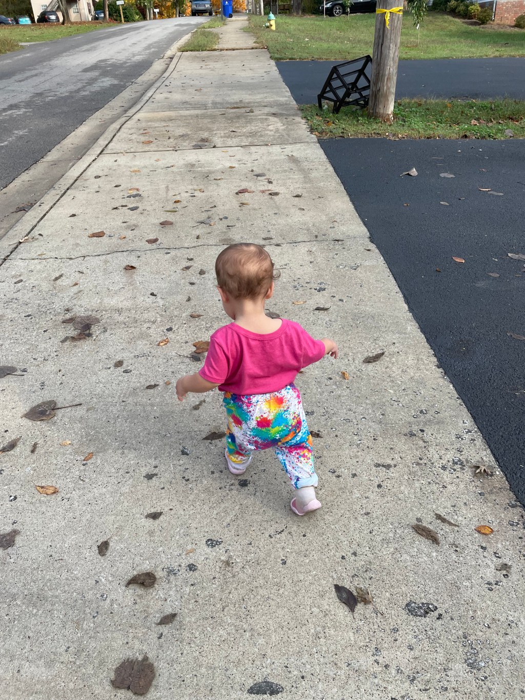 Tapping, dancing, experimenting, her day is full just the two of us but we’re not alone for long. Eventually, dada comes home and big brother too. Then the fun begins because it’s hard work being a baby. She’s got nursing to do, materials to explore, and food to throw. Teeth upon teeth to cut, it seems.
