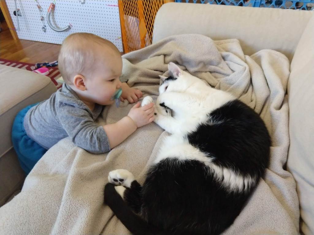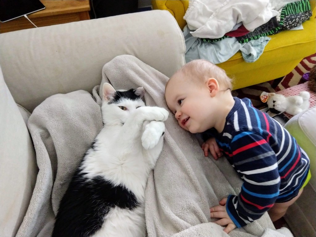 Navigating a cat and toddler can be a handful. Juniper, our current toddler, is not too gentle with Felix. Theo almost always was. You can see how little instinct Felix has to get away. June will do the same things, except she prefers to put her face right in that kitty belly. So soft and warm. Felix was not too interested in sharing me with Theo, as you can see in this last picture. It’s a pain sometimes parenting children to be gentle when the cat could easily get away, but I’m also thankful for it! Theo has always been a very gentle child, and I think having an older kitty brother helped immensely in parenting him. 😉