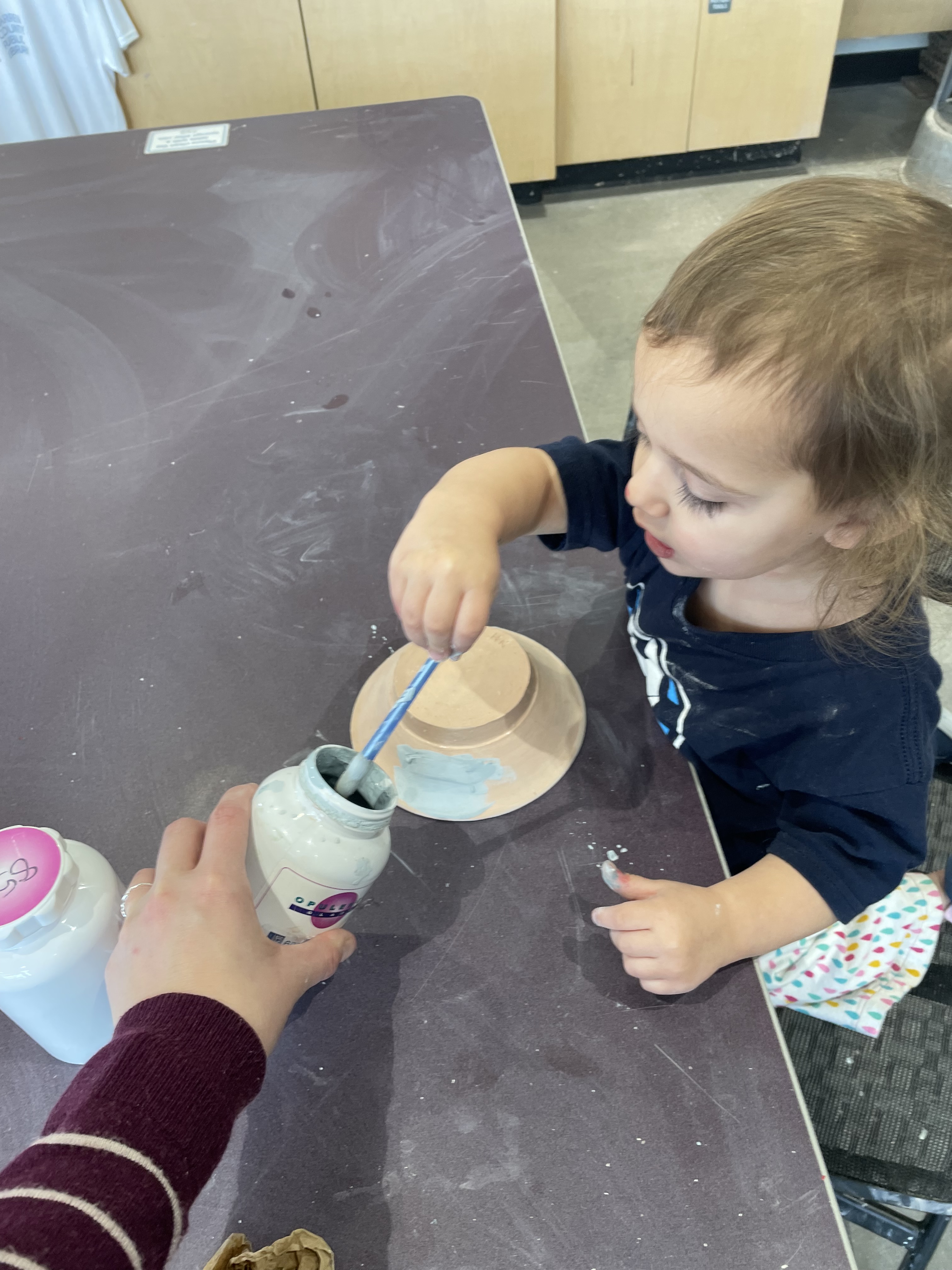 Juniper is quite taken these days with art and color and fine-motor-skills tasks, which made this an ideal environment for us both getting a little of what we want; I wanted to get my pieces in the next glaze firing, and she wanted to explore. She always wants to explore these days. It’s beautiful, refreshing, inspiring, and exhausting. Not to give too much away, but nothing was broken-not my pieces, nor anyone else’s in the shared space! Whew! Already a major win. The cherry on top was that we actually managed to get the three pieces glazed.